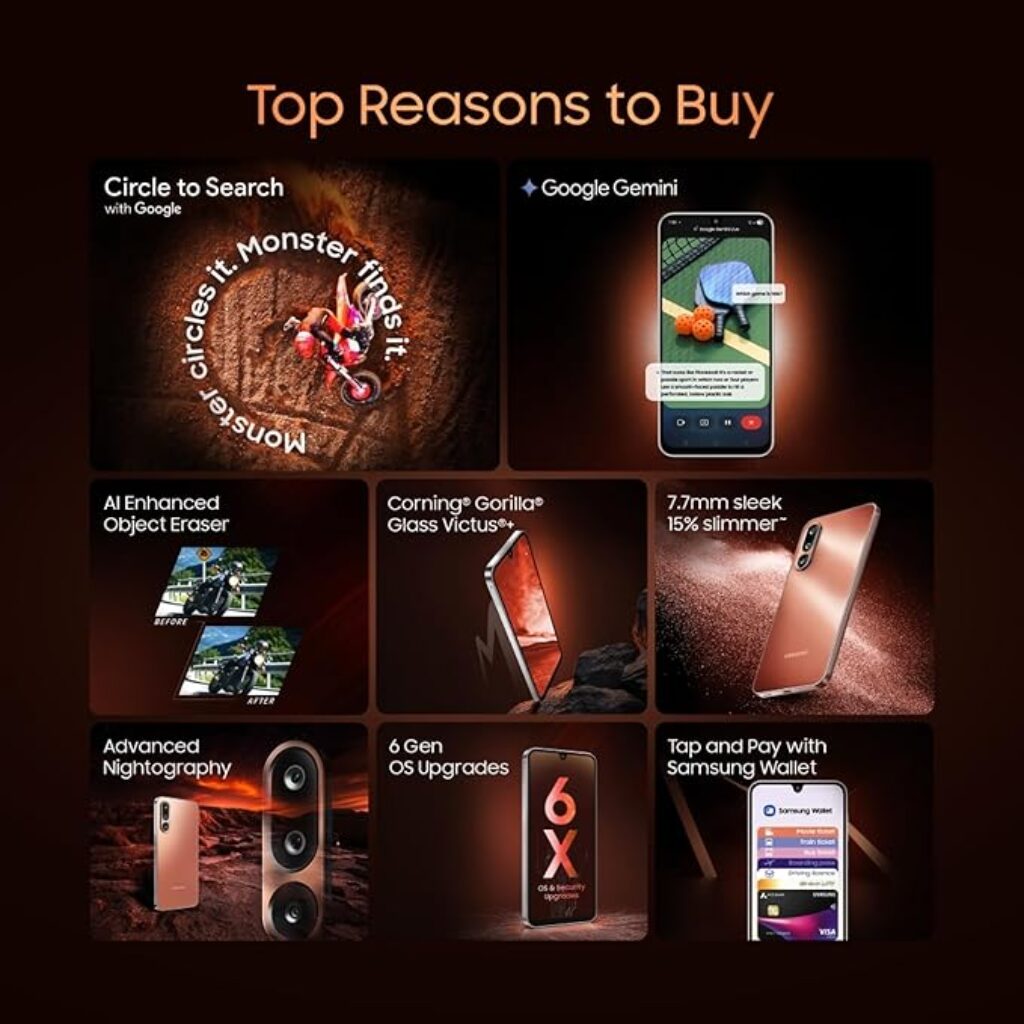 The Samsung Galaxy M36 5G strikes a perfect balance between style, performance, and intelligence. With features like Google Gemini AI, Circle to Search, a durable Gorilla Glass Victus+ body, and an AI-powered camera system, it delivers a flagship-like experience at a mid-range price.
